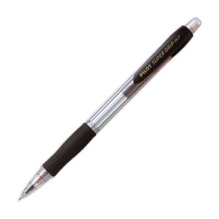 Super GripUn modèle très ergonomique.Corps plastique transparent.Clip et grip caoutchouc de couleur.Gomme protégée. Canon rentrant.Avance de la mine par poussoir.Mine