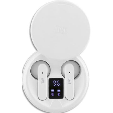 Format semi intra-auriculaires. Contrôle tactile. Alimentation : Batterie lithium-polymère intégrée 30 mAh (écouteurs) / 180 mAh (boîtier de chargement). Autonomie