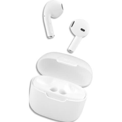 Format semi intra-auriculaires. Contrôle tactile. Alimentation : Batterie lithium-polymère intégrée 30 mAh (écouteurs) / 180 mAh (boîtier de chargement). Autonomie