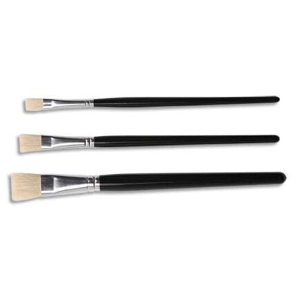 Brosses plates en soie Manche bois laqué, virole alu monobloc sertie. 3 tailles assorties 6 / 10 / 16. Longueur