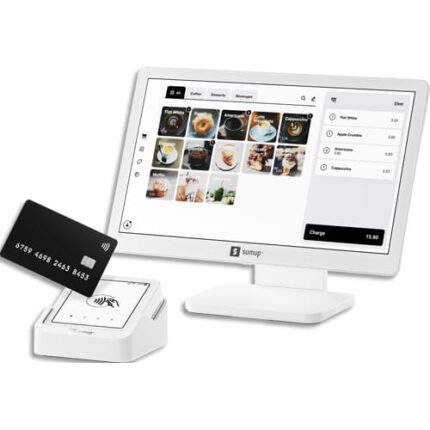 Système de caisse LITE et terminal SOLOLogiciel de caisse préinstallé gratuit. Tablette tactile SUMUP de 13 » full HD avec support.