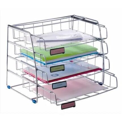 Trieur 3 ou 4 corbeillesEn fil d’acier chromé. Indexation par porte-étiquettes. Corbeilles coulissantes.Patins antidérapants. Pour documents jusqu’au format 24 x