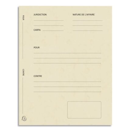 Dossier de plaidoirieEn carte lustrée 265 g. Couverture pré-imprimée. Permet l’utilisation des sous cotes.Coloris assortis : Ivoire, Jaune, Orange, Rouge,