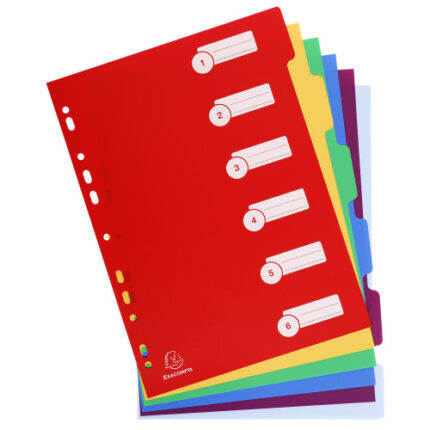 IntercalaireColoris vifs.En polypropylène opaque coloris vifs 3/10e. Page de garde. Perforation 11 trous.Format A4.6 touchesPremier index imprimé avec des zones