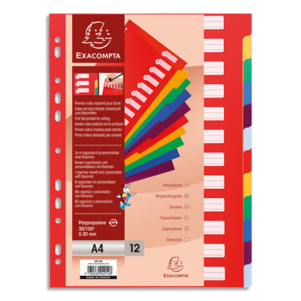 IntercalaireColoris vifs.En polypropylène opaque coloris vifs 3/10e. Page de garde. Perforation 11 trous.Format A4.12 touchesPremier index imprimé avec des zones