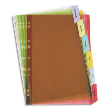 Intercalaire à onglets personnalisablesEn PVC transparent coloré. Onglets personnalisables avec étiquettes bristol.Livré avec 1 jeu d’étiquettes.Format A4+PVC 17/100e.6 touches Produit