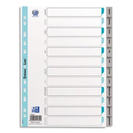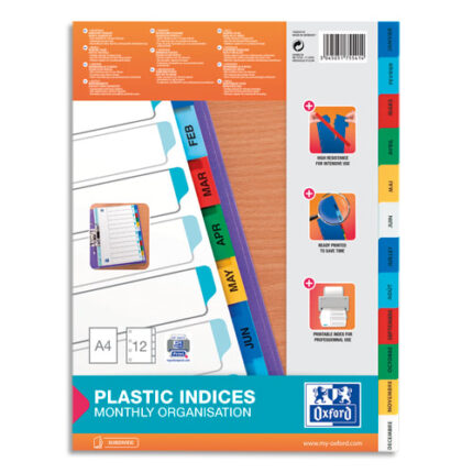 Intercalaire impriméColoris classique!En polypropylène opaque 12/100e. Page de garde personnalisable. Perforation 11 trous. Format A4.AlphabétiqueJanv-Déc Produit éco-responsable : Recyclable à