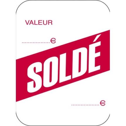 Etiquette pour pistolet textileÉtiquette pré-imprimée »soldé »Boîte de 1000 étiquettes perforées.4,9 x 6,5 cm Produit éco-responsable : Recyclable à 100%