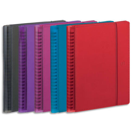 Couverture bi-matière PVC expansé, toucher soyeux, dos polypropylène translucide ultra résistant. Elastique de fermeture. Réglette amovible en polypro avec marque-pages
