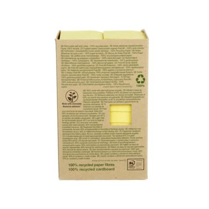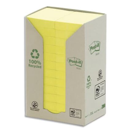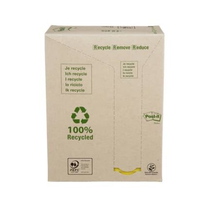 Bloc 100% recycléLibre service écologique!La note Post-it® 100% écologique, papier 100% recyclé. Sans emballage individuel, tour distributrice en carton recyclé