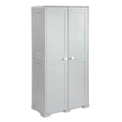 Armoire de rangement En polypropylène. Armoire haute utilitaire 2 portes, à gauche emplacement balai et à droite 3 compartiments. Deux