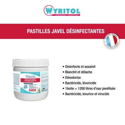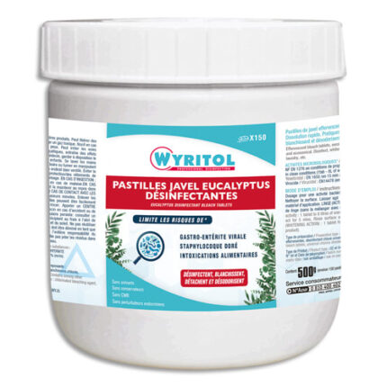 Les pastilles eau de Javel Wyritol sont bactéricides, levuricides, virucides.Les pastilles effervescentes sont parfumées à l’Eucalyptus. Leur dissolution est rapide.
