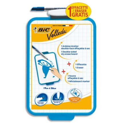 BIC Velleda Ardoise Ecolier Double Face Effaçable + Feutre Bleu Effaçable + Effacette – Turquoise x1
