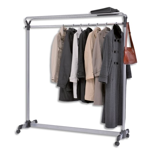 Vestiaire mobile composé d’une étagère supérieure pour bagages et sacs, de 2 crochets en plastique pour accessoires et de 4 roulettes double galet dont 2 avec freins. 3 cintres en acier inclus.
