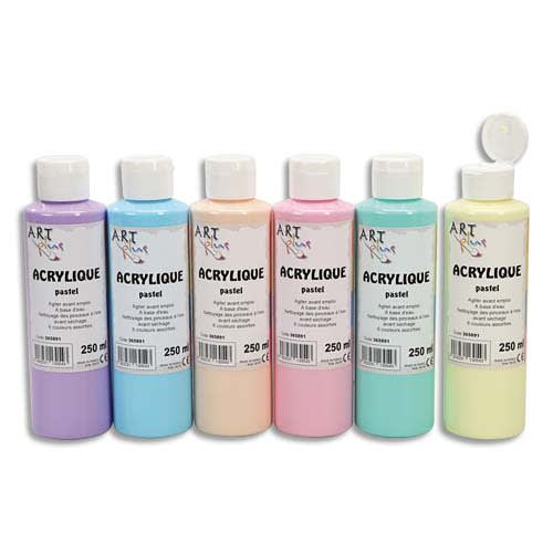 ART PLUS Lot de 6 flacons 250ml d’acrylique. Assortis pastel : Violet, Beige, Jaune, Bleu, Rose, Vert