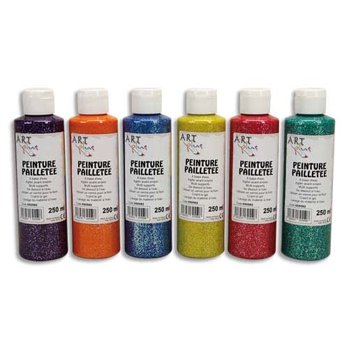 ART PLUS Lot de 6 flacons 250ml gouache. Assortis pailleté : Bordeaux, Vert, Violet, Bleu, Jaune, Orange