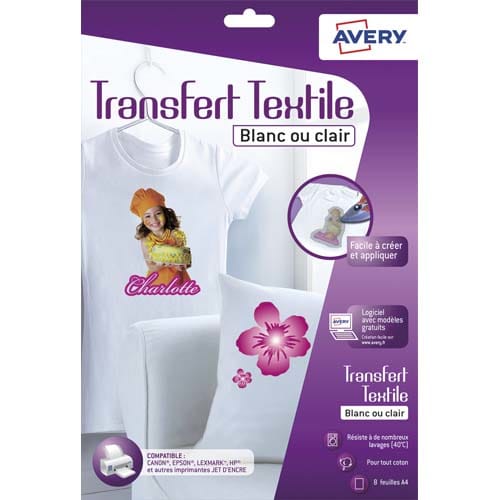 AVERY Boîte de 8 feuilles transferts pour tee-shirt Blanc ou clair