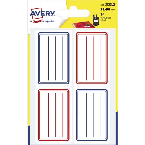 AVERY Sachet de 24 étiquettes scolaires lignées Bleu et Rouge 36 x 56 mm.