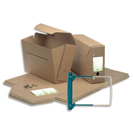 En carton ondulé Blanc imprimé Bleu 100% recyclé et recyclable sans acide. Zones d’indexation et œillets de préhension.