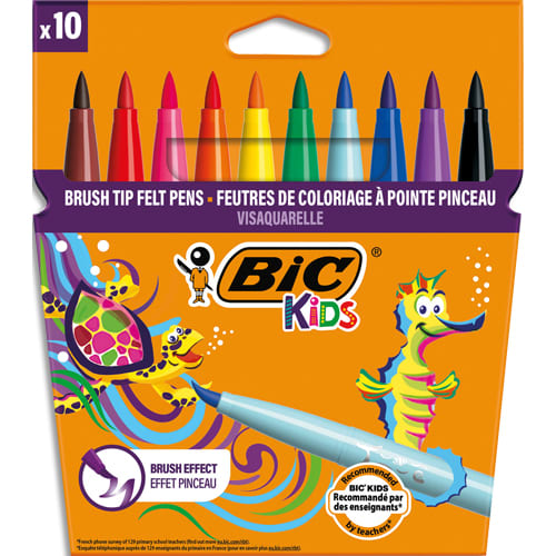 BIC KIDS Visaquarelle Feutres de Coloriage avec Pointe Pinceau – Couleurs Assorties, Etui Carton de 10