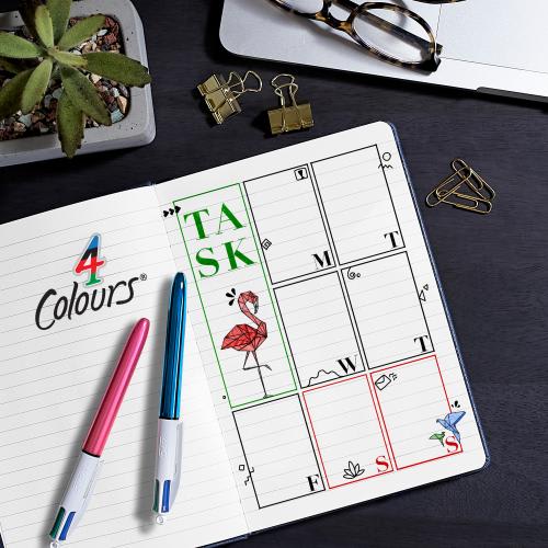 BIC Stylo bille 4 couleurs rétractable Shine. Pointe Moyenne (1,0 mm) – Corps Métallisé Rose