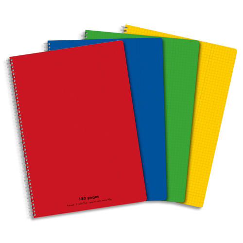 Cahier spirale 21×29,7cm 180 pages petits carreaux 5×5 90g. Couverture polypro assortie