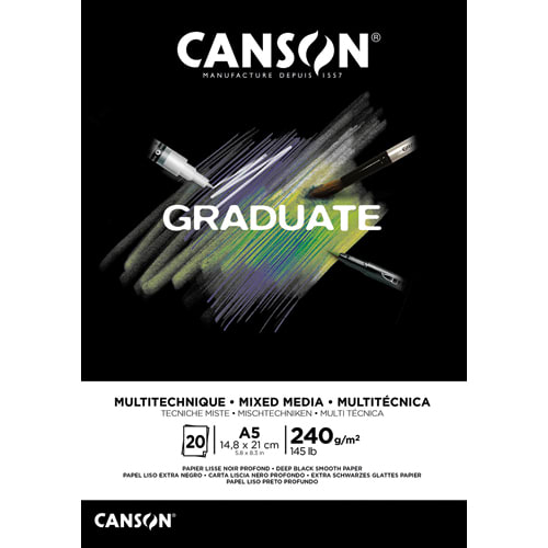 CANSON Bloc de 20 feuilles GRADUATE MIXED MEDIA. Format A5, 240 grammes. Papier lisse noir profond. Collé