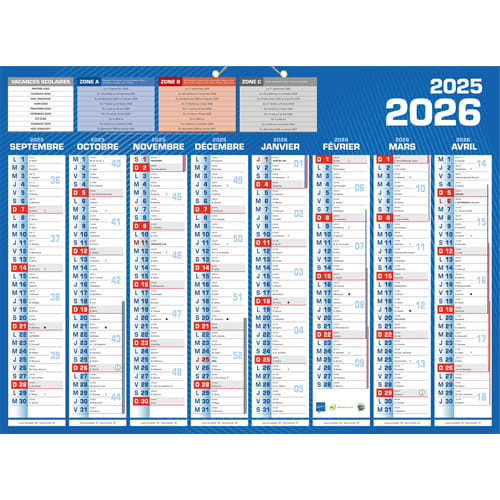 QUO VADIS Calendrier Janvier à Décembre avec vacances scolaires en haut, format 67,5 x 43 cm Bleu