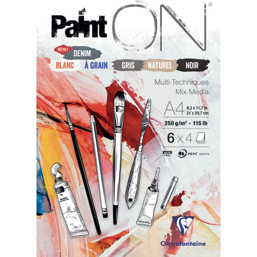 CLAIREFONTAINE Bloc PaintON collé 24F 250g. A4.Assortis 6×4 blanc, à grain, gris, naturel, noir et denim