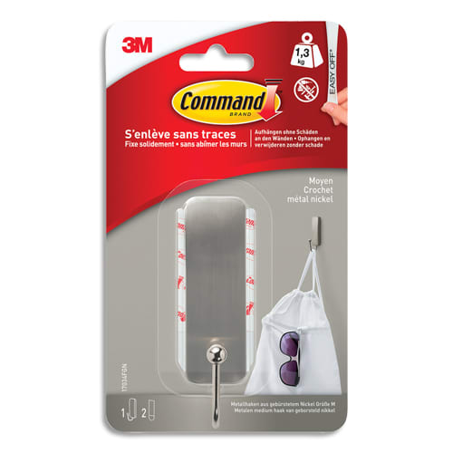 COMMAND Crochet simple adhésif 3M moyen en métal nickel – poids supporté 1,3kg – s’enlève sans trace