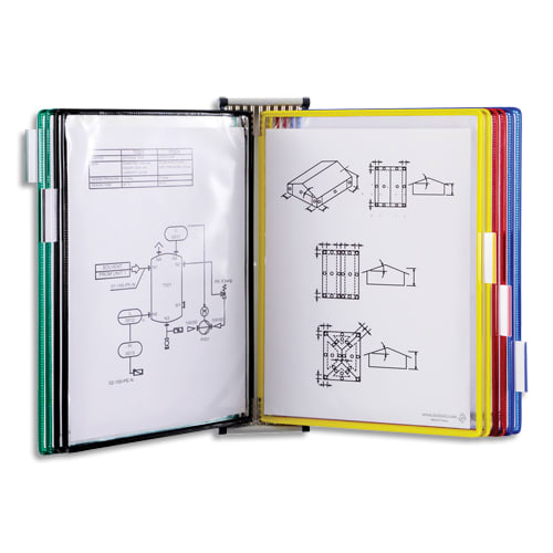 En métal Gris clair équipé de supports latéraux. Inclinable pour faciliter la lecture. Livré complet avec 10 poches, 5 Coloris assortis (Rouge, Bleu, Vert, Jaune, Noir), 5 cavaliers d’indexage (50 mm), étiquettes et kit de fixation. Capacité : 10 pochettes, soit 20 vues.