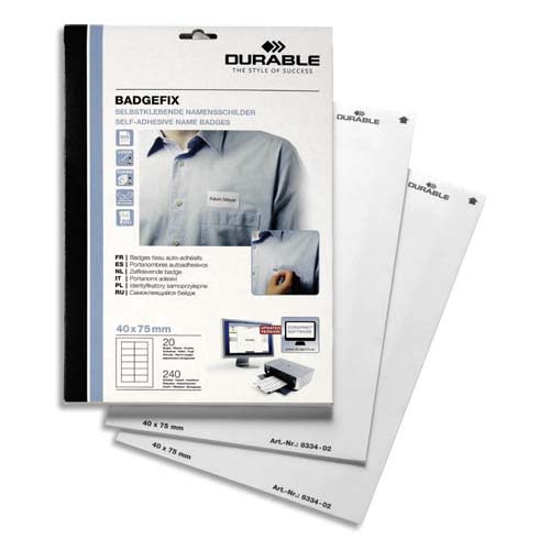 DURABLE Boîte 240 Badges adhésifs Badgefix en tissu imprimables – H40 x L75 mm