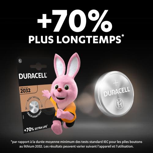 *Par rapport à la durée moyenne minimum des tests standard IEC des piles boutons au lithium 2025. Les résultats peuvent varier suivant l’appareil et l’utilisation.
