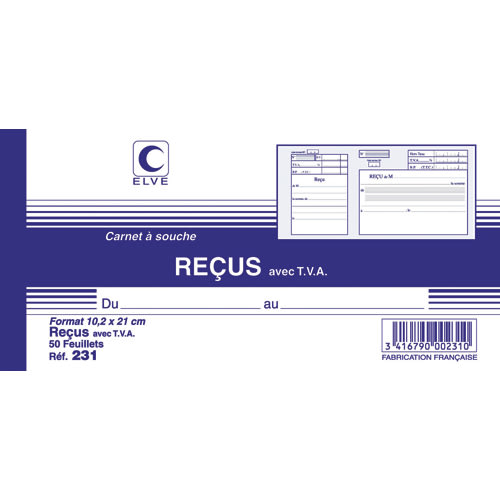 ELVE Carnet à souche »reçu avec TVA » format 10,5 x 21cm, 50 feuillets 231
