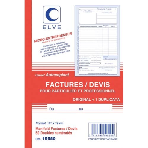 ELVE Manifold entrepreneur autocopiant factures / Devis format 210x140mm. 50 feuillets dupli