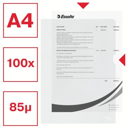 ESSELTE Boîte de 100 pochettes-coin – Format A4 – polypropylène grainé 11/100e 30% recyclé – Transparent