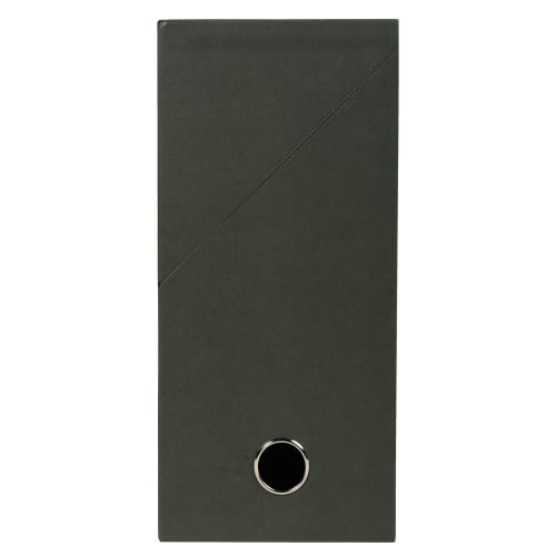 En carton fort encollé d’un papier recyclé teinté dans la masse. Œillet de préhension métal. Coloris Vert foncé.