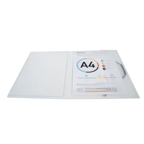 En polypropylène 5/10e. Fermeture par élastique. Pochette cristal transparente sur la couverture.