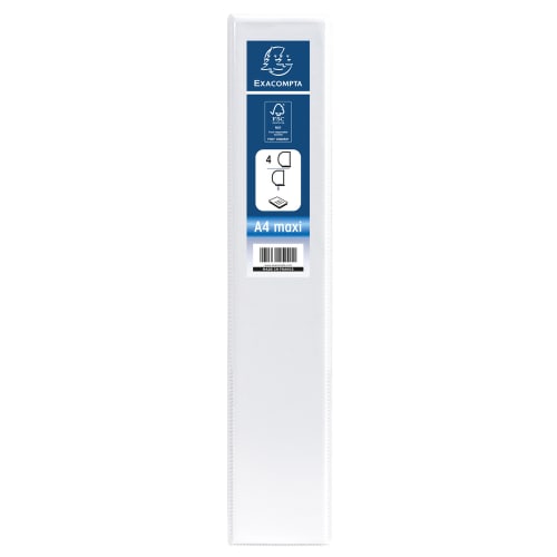 En carton recouvert de polypropylène. Mécanisme 4 anneaux en D. Personnalisable sur 3 faces (couverture, tranche et dos). Pochettes intérieures en 2ème et 3ème de couverture. Pour format A4+. Coloris Blanc.
