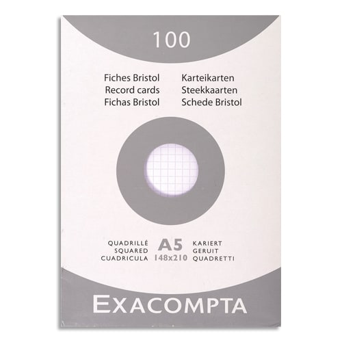 EXACOMPTA Etui de 100 fiches bristol non perforées 148x210mm (A5) quadrillées 5×5 Blanc
