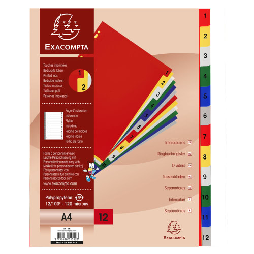 EXACOMPTA Jeu d’intercalaires numériques en polypropylène. 12 touches multicolores. Format A4.