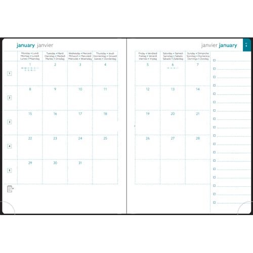 L’agenda-calendrier ultra fin ! Couverture souple, certification PEFC. EasySlim 21. Mise en page mois par mois avec planificateurs annuels et pages de notes. Coins de page perforés pour faciliter la consultation. 1 mois sur 2 pages – 15 x 21 cm. Noir.
