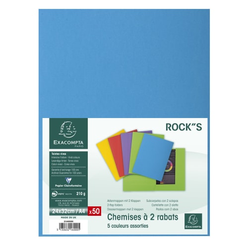 EXACOMPTA Paquet 50 chemises 2 rabats carte 210g ROCK »S. Coloris assortis Bleu/Jaune/Rouge/vert/Violet