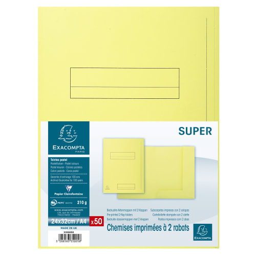 EXACOMPTA Paquet de 50 chemises pré-imprimés 2 rabats SUPER 250 en carte 210 grammes coloris Jaune
