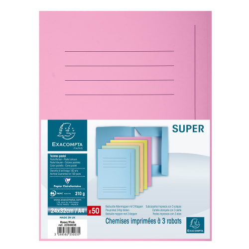 EXACOMPTA Paquet de 50 chemises pré-imprimés 3 rabats SUPER 250 en carte 210 grammes Rose