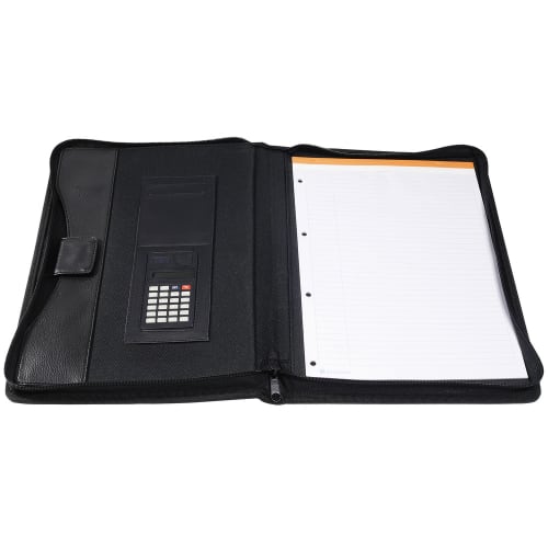 Porte-bloc conférencier pratique et résistant, avec fermeture zippée. A l’intérieur, une double poche avec fermeture pression pour documents A4, porte-stylo et emplacement pour carte de visite.