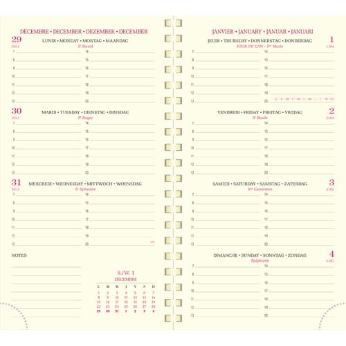 Recharge Eurotime. Janvier à Décembre. PEFC – Imprim’vert. 16S. Poche spiralée Semainier, La semaine sur 2 pages à l’horizontal, 7 jours complets, large amplitude horaire avec RDV de 7h à 20h, édition multilingue. Format : 9×16 cm.