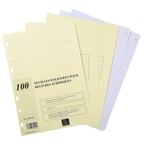 Recharge 100 feuilles vierges, foliotées et perforées pour reliures juridiques 4 ou 6 anneaux. Papier format A4, grammage 80 g/m2, certifié FSC®, une gestion responsable des forêts.