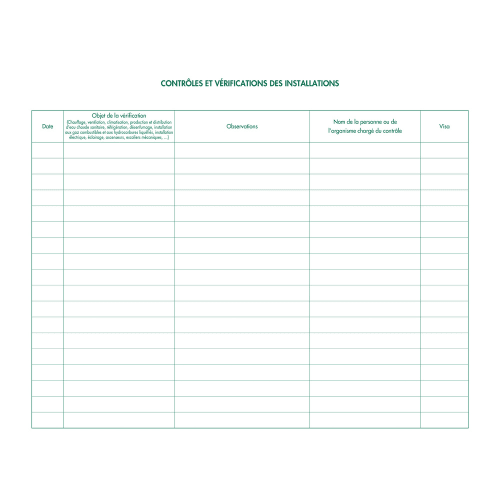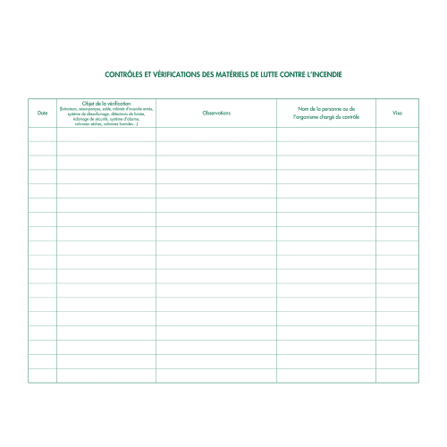 Permet de consigner les renseignements indispensables à la protection contre les risques d’incendie et de panique dans les établissements recevant du public (numéros et adresses utiles, inventaire du matériel de lutte anti-incendie, personnel chargé du service incendie, consignes en cas d’incendie, dates des contrôles, …)