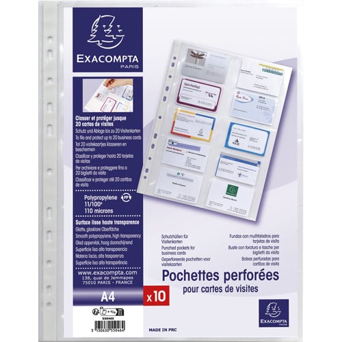 EXACOMPTA Sachet de 10 pochettes perforées cartes de visite en PP 11/100e. Format A4. Perforation 11 trou